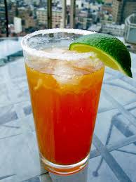 En cada copa escarchada con sal, poner una porción de jugo de tomate.En cada copa, agregar la salsa picante, la salsa de soya y el jugo de limón.